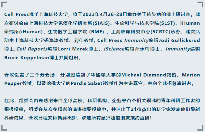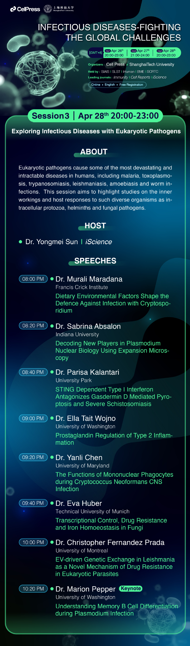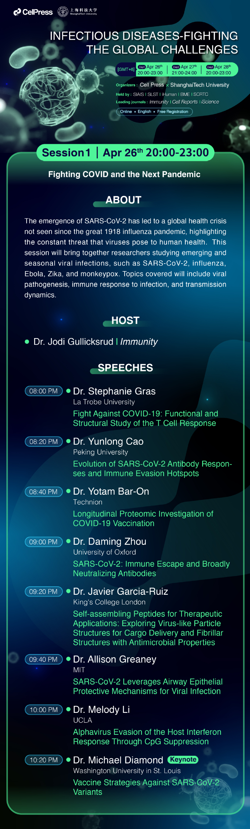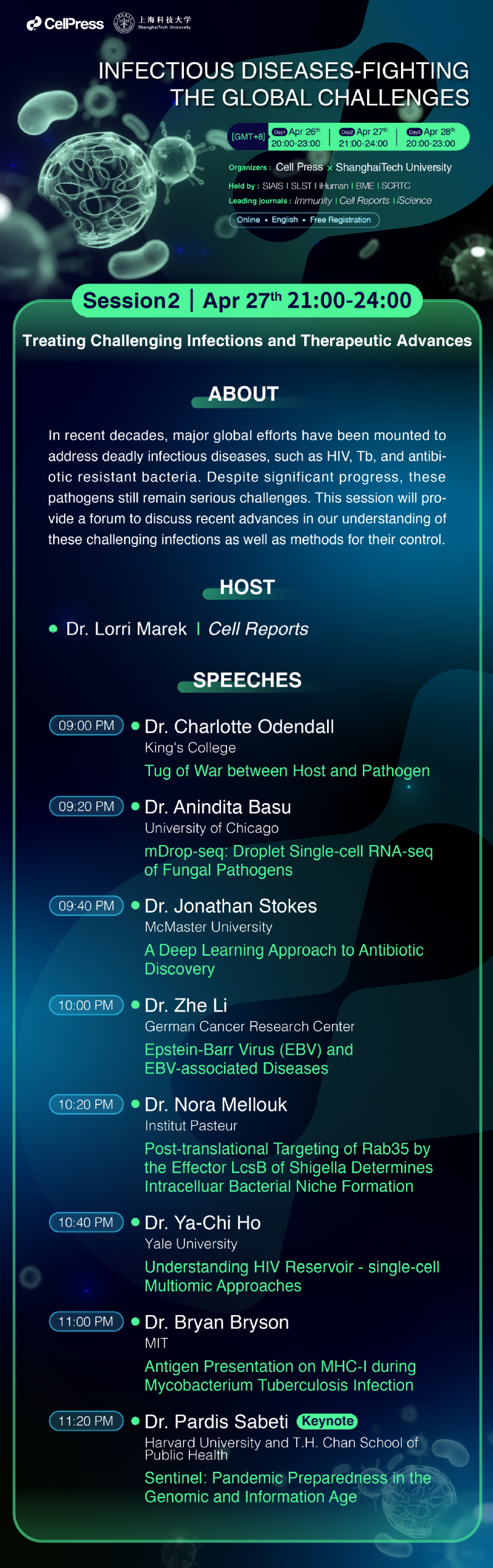 历史上,传染病一直在渗透和塑造着我们的社会。当下,新型冠状病毒的全球大流行便是鲜明的例子。本次会议将聚焦于探索我们面临的挑战,以及在与传染性病原体斗争中所有可利用工具和技术手段的前沿进展。本次会议以尖端前沿研究为特色,从宿主和病原体两个角度,讨论包括病毒、细菌、寄生虫和真菌等病原体在内的相关研究,旨在促进全球范围内的科学交流。