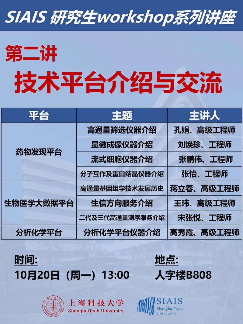 免疫化学研究所将于10月20日(周一、13:00)在人字楼B808举行SIAIS研究生workshop系列讲座,第二讲《技术平台介绍与交流》,本次讲座会给大家全面介绍我们免化所的技术平台,涵盖技术团队、仪器配置、软件资源、服务内容、预约使用等多个方面。诚邀各位同学、特别是研二和研一的同学们参加,也非常欢迎各位老师们参加!