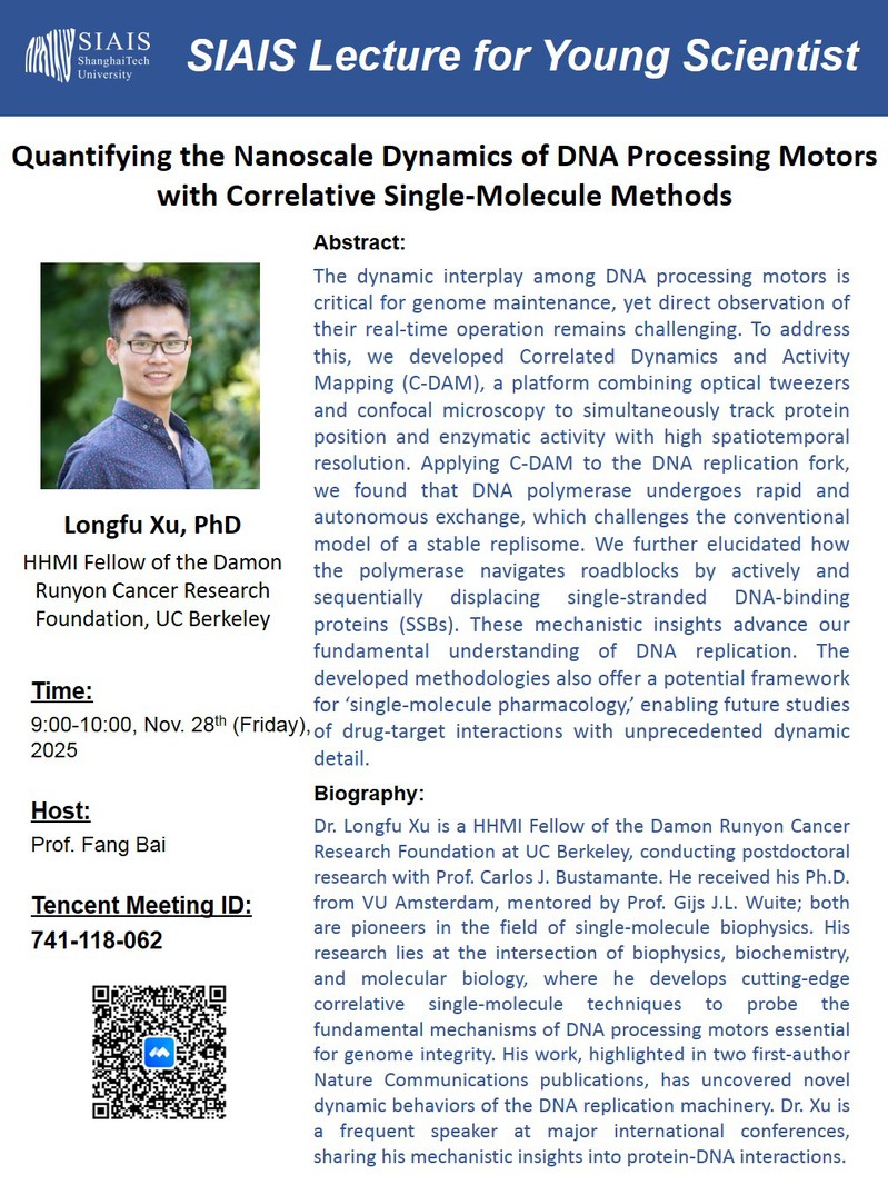 Dr. Longfu Xu is a HHMI Fellow of the Damon Runyon Cancer Research Foundation at UC Berkeley, conducting postdoctoral research with Prof. Carlos J. Bustamante. He received his Ph.D. from VU Amsterdam, mentored by Prof. Gijs J.L. Wuite; both are pioneers in the field of single-molecule biophysics. His research lies at the intersection of biophysics, biochemistry, and molecular biology, where he develops cutting-edge correlative single-molecule techniques to probe the fundamental mechanisms of DNA processing motors essential for genome integrity. His work, highlighted in two first-author Nature Communications publications, has uncovered novel dynamic behaviors of the DNA replication machinery. Dr. Xu is a frequent speaker at major international conferences, sharing his mechanistic insights into protein-DNA interactions.