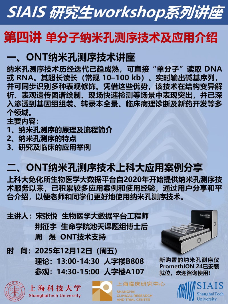 免疫化学研究所将于1212日(周、13:00)人字楼B808举行SIAIS研究生workshop系列讲座,第四讲《单分子纳米孔测序技术及应用介绍》。本次讲座包括理论和参观两个部分,将会给大家介绍ONT纳米孔测序技术和上科大应用案例分享。