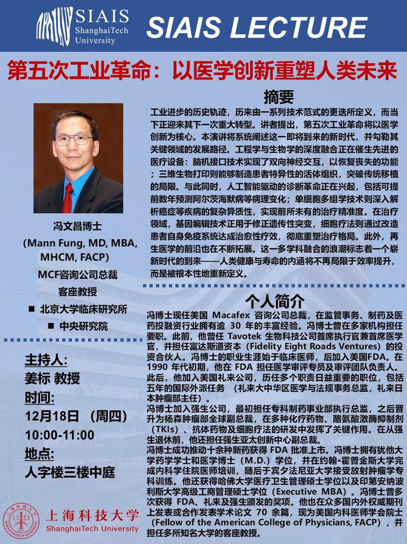 免疫化学研究所将于12月18日(周四10:00)在人字楼三楼中庭举行SIAIS Lecture,诚邀各位老师和同学们参加!