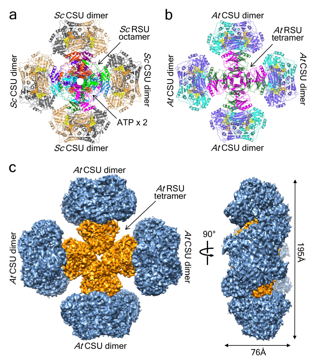 a. ScAHAS. Eight RSUs in different colours, each containing a single ACT domain, form a central core on which four CSU dimers are attached. Four ATP pairs (red transparent surface) are bound between RSU dimers. b. AtAHAS. Four RSUs (magenta and green), each containing two pseudo repeats of the ACT domain, form the central core. c. The cryo-EM map for AtAHAS.